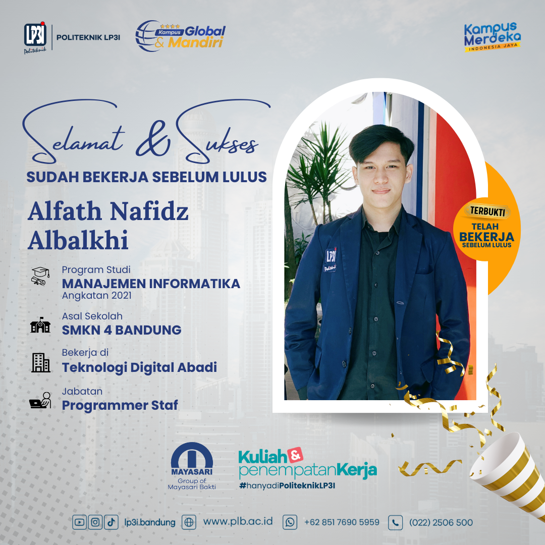 Selamat kepada Alfath Nafidz Albalkhi, mahasiswa angkatan 2021 program studi Manajemen Informatika yang sudah diterima bekerja di Teknologi Digital Abadi.
