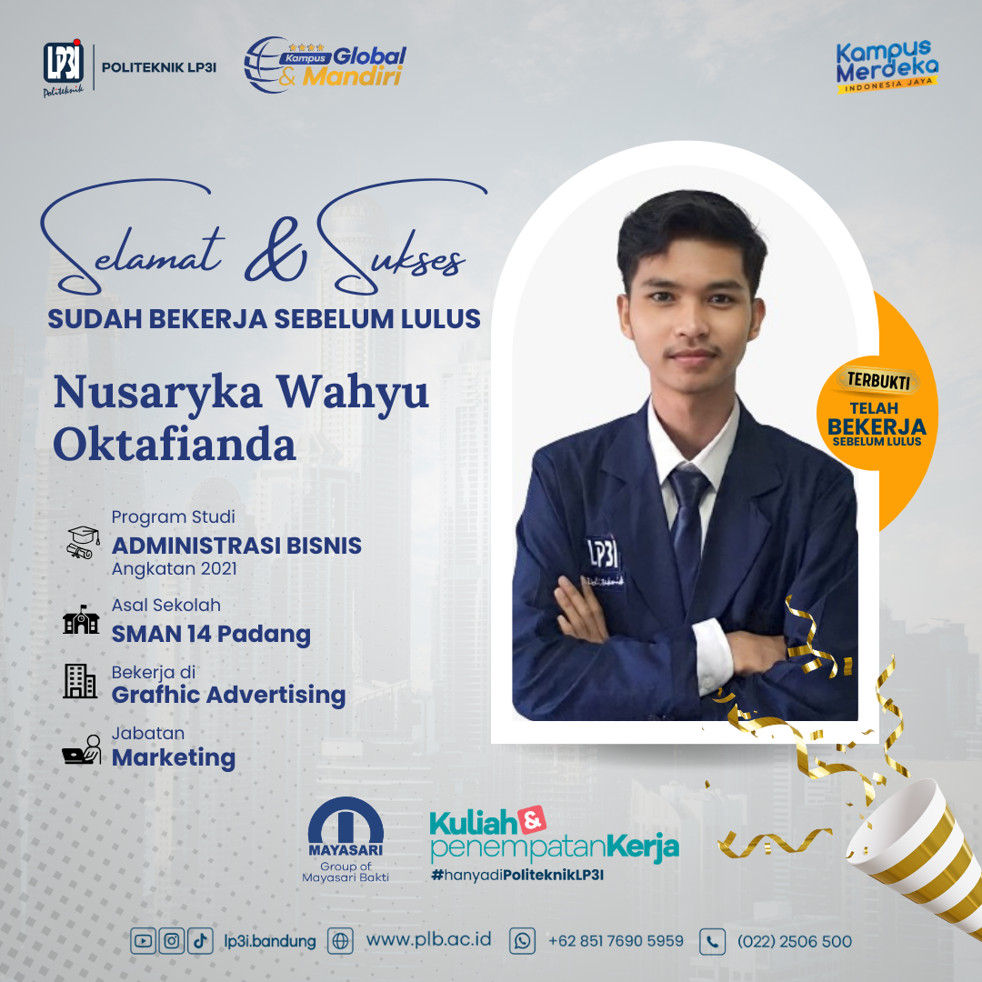 Nusaryka Wahyu Oktafianda, mahasiswa angkatan 2021 program studi Administrasi Bisnis yang sudah diterima bekerja di Grafhic Advertising.